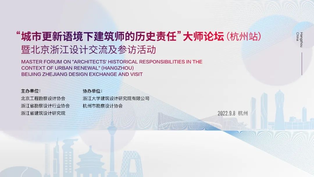 9月8日下午,浙江省建筑設計研究院綜合樓報告廳迎來了“城市更新語境下建筑師的歷史責任”大師論壇(杭州站)。