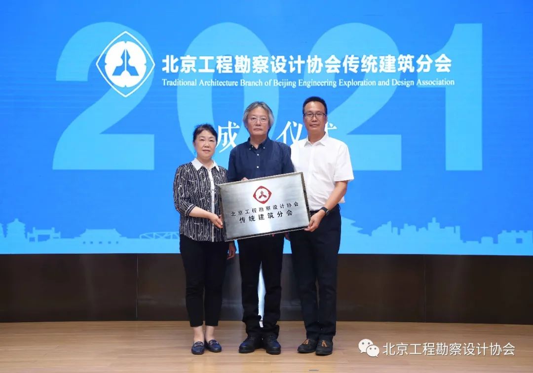 北勘設協副會長、中國建筑設計研究院有限公司總經理馬海,北勘設協秘書長胡頤蘅代表協會向分會籌備單位的代表——北勘設協傳統建筑分會會長、中國建筑設計研究院有限公司建筑歷史研究所所長王力軍授予協會“傳統建筑分會”的牌匾。