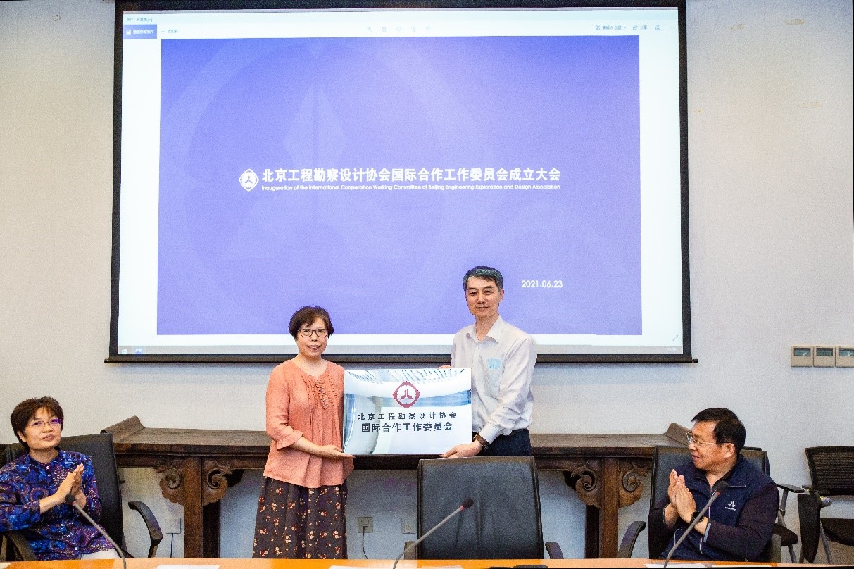 ?2021年6月23日下午,北京工程勘察設計協會國際合作工作委員會成立大會在北京市建筑設計研究院有限公司召開,并舉行授牌儀式。北京市規劃和自然資源委員會二級巡視員陶志紅出席并致辭,勘察設計管理處副處長吳鵬,北京工程勘察設計協會秘書長胡頤蘅、陳德成、辦公室主任徐麗、行業發展部部長張曉剛,以及北京凱欣城市發展咨詢有限公司總經理張國生等20家會員單位的代表參加。??陶志紅指出北京建筑界的國際交流活動在未來行業發