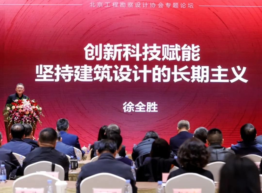 隨后的主題論壇,北京工程勘察設計協會會長、北京市建筑設計研究院股份有限公司黨委書記、董事長徐全勝,作了題為《創新科技賦能 堅持建筑設計的長期主義》的主題報告。他強調,長期主義不僅是行業的價值觀,也是實現高質量發展的關鍵方法論。這一理念應貫穿建筑的整個生命周期,體現在建筑的持久價值、科學的設計理念、建筑師的職業操守以及企業的可持續發展上。他指出,建筑既是文化的載體,也是科技的體現,優秀的建筑應融合功能性、藝術性和前瞻性。面對行業轉型,建筑設計應借助科技創新,推動行業從滿足基本需求向追求卓越品質轉變。他呼吁全行業以長期主義為指導,服務于國家戰略,為中國式現代化貢獻建筑設計的智慧和力量。