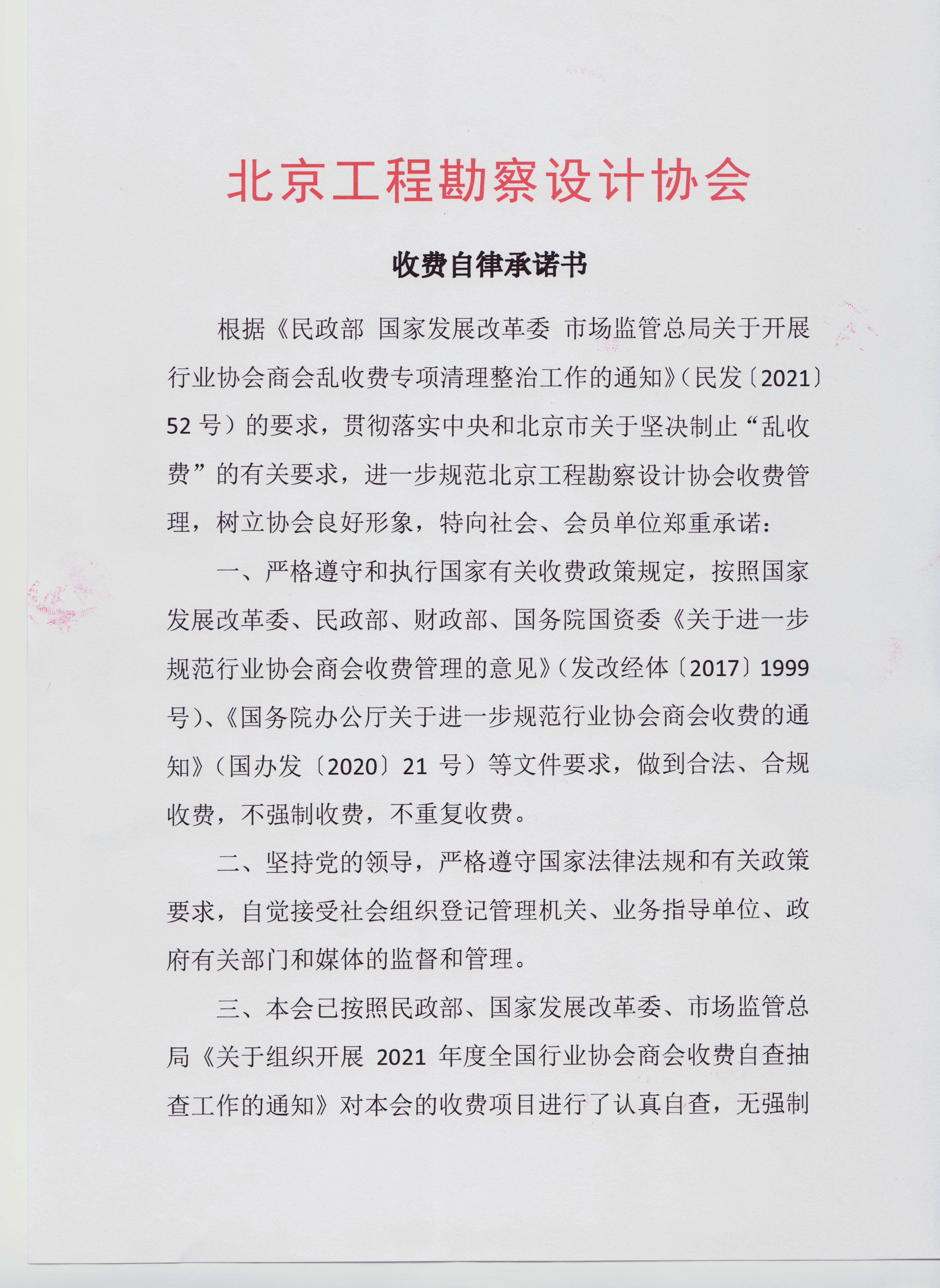 根據《民政部 國家發展改革委 市場監管總局關于開展行業協會商會亂收費專項清理整治工作的通知》(民發〔2021〕52號)的要求,貫徹落實中央和北京市關于堅決制止“亂收費”的有關要求,進一步規范北京工程勘察設計協會收費管理,樹立協會良好形象,特向社會、會員單位鄭重承諾: