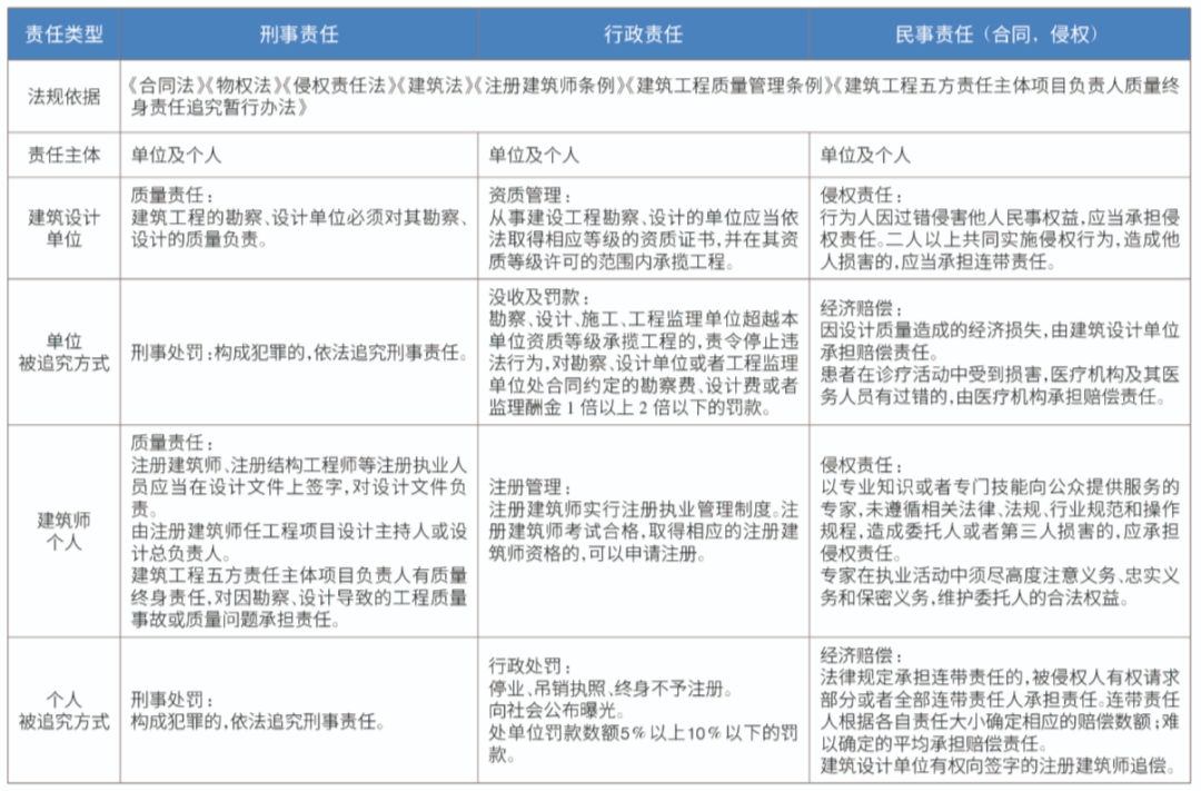 建筑工程是一個典型的項目,具有項目的特點。建筑工程本身的一次性、定制生產、臨時組織的團隊、現(xiàn)場施工和管理,使得建筑項目本身具有單一性、創(chuàng)新性和風險性。項目(project)是指一系列獨特的、復雜的并相互關聯(lián)的活動,這些活動有一個明確的目標或目的,必須在特定的時間、預算、資源限定內完成。美國項目管理協(xié)會(Project Management Institute,PMI)在其出版的《項目管理知識體系指南》(Project Management Body of Knowledge,PMBOK)中對項目的定義是:項目是為創(chuàng)造獨特的產品、服務或成果而進行的臨時性工作。項目的一次性、團隊暫時性、漸進明晰,是項目的三大特征。建筑設計咨詢作為建筑物施工前的建造計劃,是質量控制PDCA循環(huán)中的計劃工作,是一次圖文媒介為基礎的虛擬建造,因此具有計劃與現(xiàn)實差別的巨大風險。同時,由于建筑項目的獨特性、創(chuàng)新性、非標準化的沖動,具有很強的一次性和風險性。設計咨詢服務的收費僅占整個項目很低的份額,但卻可能撬動極大的收益和損失,具有杠桿的放大效果,加之建筑項目的巨大規(guī)模、外部性,使得建筑項目具有更大的風險性。由于項目組織形式的臨時性和復雜性,在每個設計項目中負責的建筑師、項目負責人就需要帶領一個臨時組織的多專業(yè)團隊,在多專業(yè)的協(xié)同中完成復雜的技術方案設計和驗證。由于多專業(yè)、多主體參與,每個人的能力與經驗、審慎盡職的態(tài)度、專業(yè)團隊協(xié)作等都對項目的推進具有重大影響作用,建筑師還可能要承擔因別人的過失帶來的連帶責任,因此具有專家責任的巨大風險[2]。建筑設計企業(yè)和作為項目負責人的建筑師的職業(yè)責任巨大,作為民事主體,應因其行為應當承擔的責任主要有三類:民事責任、行政責任和刑事責任。其中,民事責任包括合同責任和侵權責任。我國《建筑法》《建設工程質量管理條例》《注冊建筑師條例》《建筑工程五方責任主體項目負責人質量終身責任追究暫行辦法》等建筑領域的法律及行政法規(guī)明確規(guī)定了建筑設計單位和建筑師個人的行政責任和刑事責任。我國《民法典》(包含原有的《民法》《合同法》《侵權責任法》等)明確規(guī)定了建筑設計單位和建筑師個人的民事責任,包括合同責任和侵權責任。由于設計咨詢合同的主體是設計單位而非建筑師個人,因此合同責任主要追究到單位。但是侵權責任,尤其是專家責任的侵權責任,則明確可以追究到個人。我國司法界的認識是:律師、醫(yī)師、會計師、建筑師等都是專門領域的專家,其承擔的責任是專家責任。在建筑師的設計服務過程中,以建筑師為代表的整個專家團隊以專門知識和技能為客戶提供有償服務,專家個人的知識、技能、職業(yè)道德、主動性與注意力、經驗等往往起著決定性作用,因此,個人的獨立性、偶然性、依賴性都極強。雖然項目在一個或數(shù)個聯(lián)合企業(yè)(機構)中實施,企業(yè)通過流程規(guī)范、質量管理、人力資源等方面提供了支持和必要條件,但是項目實現(xiàn)的好壞與企業(yè)本身的財產狀況、聲譽、經營管理方式等都沒有直接和必然的聯(lián)系[3]。因此,我國在侵權責任上的規(guī)定是:行為人因過錯侵害他人民事權益,應當承擔侵權責任。根據法律規(guī)定推定行為人有過錯,行為人不能證明自己沒有過錯的,應當承擔侵權責任。二人以上共同實施侵權行為,造成他人損害的,應當承擔連帶責任。法律規(guī)定承擔連帶責任的,被侵權人有權請求部分或者全部連帶責任人承擔責任。連帶責任人根據各自責任大小確定相應的賠償數(shù)額;難以確定責任大小的,平均承擔賠償責任。用人單位的工作人員因執(zhí)行工作任務造成他人損害的,由用人單位承擔侵權責任。用人單位有權向負有責任的個人追償。我國《注冊建筑師條例》明確規(guī)定:因設計質量造成的經濟損失,由建筑設計單位承擔賠償責任;建筑設計單位有權向簽字的注冊建筑師追償。《建筑工程五方責任主體項目負責人質量終身責任追究暫行辦法》規(guī)定:設計單位項目負責人對因設計導致的工程質量事故或質量問題承擔責任,承擔行政責任的方式包括責令停止執(zhí)業(yè)、吊銷執(zhí)業(yè)資格證書、行政罰款(單位罰款數(shù)額5%以上10%以下)等。建筑師(包括提供設計咨詢服務中的所有專業(yè)人士,如勘察、設計、工程監(jiān)理、造價咨詢、項目管理等)的責任類型及追究方式如表1所示。表1 建筑師的責任類型及追究方式