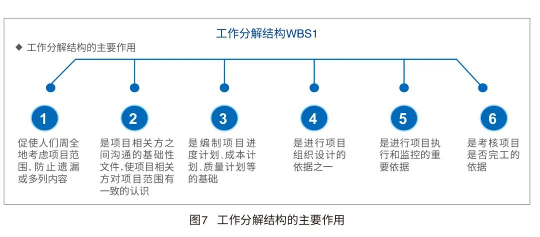 WBS的是Work Breakdown Structure(工作分解結構)的縮寫,通俗來講,WBS就是要將合同中約定的所有工作范圍層級分解。通過工作分解來不遺漏地考慮項目范圍,是項目管理工作的起點。范圍基準是項目相關方溝通的共識基礎,是項目資源需求分析的輸入,是成本、進度等基準設定的前提,是項目執行和管控的依據,有利于確保項目工作與責任分配矩陣(RAM)和組織分解結構(OBS)適當關聯(圖7)。