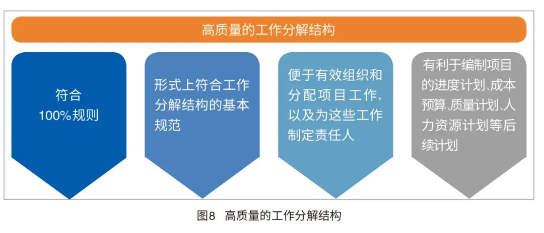 WBS工作分解的要點包括以下幾個方面:一是100%原則(不得遺漏原則);二是分解到工作包原則;三是分解程度匹配管控程度原則(圖8)。