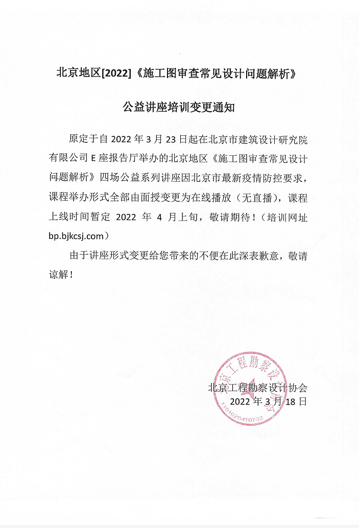 原定于自2022年3月23日起在北京市建筑設計研究院有限公司E座報告廳舉辦的北京地區《施工圖審查常見設計問題解析》四場公益系列講座因北京市最新疫情防控要求,課程舉辦形式全部由面授變更為在線播放(無直播),課程上線時間暫定2022年4月上旬,敬請期待!(培訓網址bp.bjkcsj.com)由于講座形式變更給您帶來的不便在此深表歉意,敬請諒解!