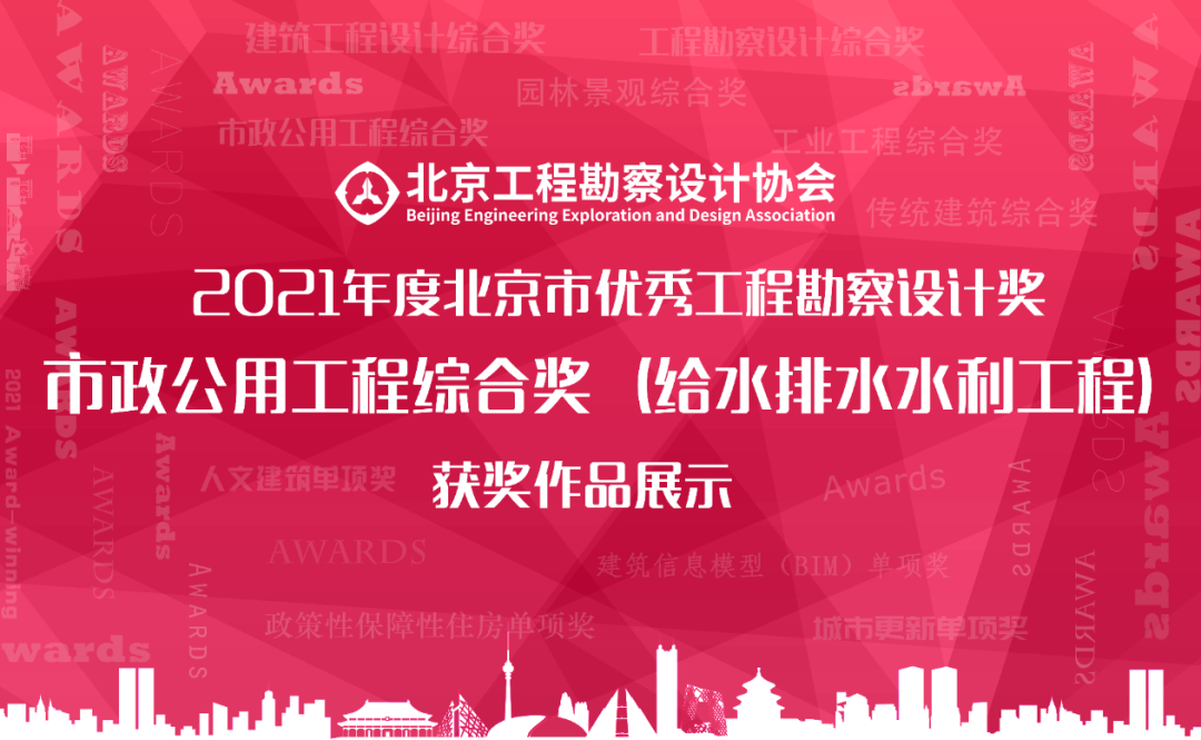 “北京市優秀工程勘察設計獎”是由北京工程勘察設計協會主辦,北京市規劃和自然資源委員會指導的北京市勘察設計行業最高獎項,分為綜合獎、專項獎、單項獎三個類別。本屆獎項評選從2021年4月27日申報開始至7月30日初審結束,評審專家組嚴格按照“北京市優秀工程勘察設計獎”評審要求,對申報項目進行認真篩選和綜合評價,經北京工程勘察設計協會審定,最終評選出綜合獎519項,專項獎262項,單項獎123項。其中,市政公用工程綜合獎(給水排水水利工程)一等獎 6 項,二等獎 10 項,三等獎 12 項,現對一等獎獲獎項目成果進行展示如下: