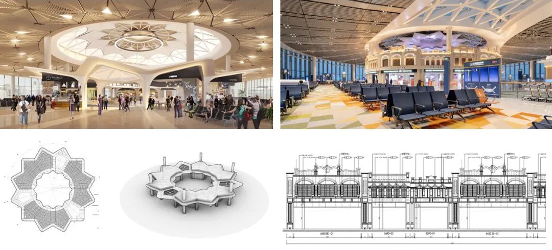 其實在設計過程中,指廊端頭的集中商業區,本有著另外的一種設計可能,我們將它命名為“花開美蘭”。這是用抽象的單元化幾何圖形去模擬花朵綻放的姿態,并與指廊端頭的采光頂形成呼應。雖然后續的內裝設計階段,業主將這里改為更加具象的“騎樓文化”,但出發點都是利用符合地域文化的商業規劃去影響航站樓內部的空間布局。
