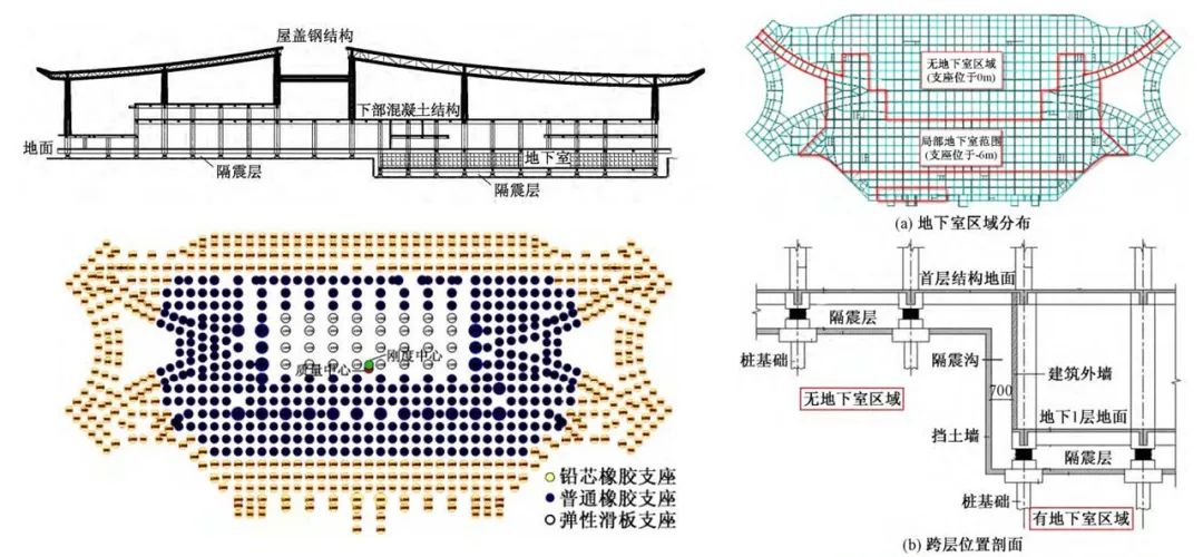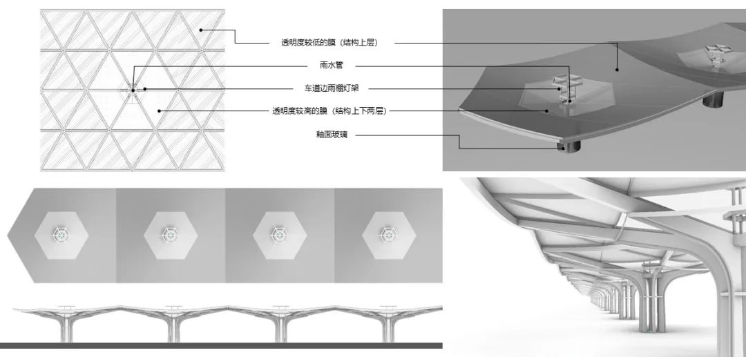 ▲ 穹頂內部“網紅打卡地” ??谧鳛橐粋€因海而生的旅游城市,我們還在航站樓中體現了大量的海洋文化元素。比較有代表性的是旅客候機區的休息座椅下的地毯。我們選擇漸變的顏色活躍室內氣氛。候機的游客仿佛置身在海邊,浪漫愜意。提到海洋文化,樓前高架橋上的車道邊雨棚也是以海浪為設計理念進行設計的。車道邊雨棚采用單元式膜結構,用簡單形式的疊加,形成類似海浪一般的韻律美。▲ 圖1 車道邊雨棚實景、圖2 車道邊雨棚設計圖紙、圖3 跨層隔震示意圖