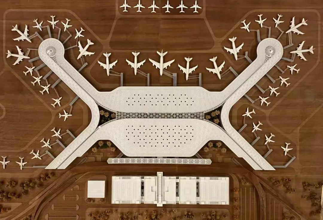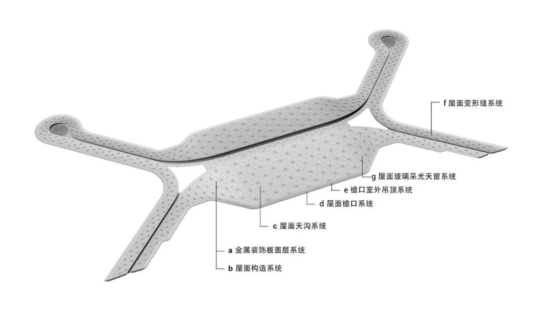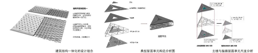 主樓的屋面圖案較大,指廊的屋面圖案較小,在轉彎處形成平滑過渡,實現屋面圖案的自然順接,呈現出自然和諧的效果。圖案大小的變化,不僅僅是出于感性美的考慮,更是來自理性美的思考。主樓跨度大,空間高度高,結構網格尺寸較大,一個主樓屋面圖案單元邊長20米;指廊跨度小,空間高度低,結構網格尺寸較小,一個指廊屋面圖案單元邊長10米。圖案大小的變化反映了建筑結構一體化以及標準化、模數化的設計理念。圖案的變化順應內部結構的變化,而結構的變化是基于受力分析和計算得來的,是由一步步理性思考推導得來的。主樓和指廊的三角形單元,均是一個高度整合的屋面單元。結構網格與屋面圖案相對應,達到結構與裝飾相統一的目標。建筑結構、金屬屋面、采光天窗、內部吊頂、機電設施高度整合在一個系統中。這樣的屋面設計,既實現了遮陽、排水等功能的需求,也構建了具有地域特色的第五立面。