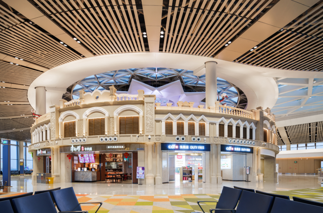 經過室外庭院,旅客繼續沿著天窗的指引通向候機指廊。在指廊端頭,我們設置了符合??诘赜蛭幕尿T樓商業區。這一設計靈感來源于??讵毺氐尿T樓文化,試圖體現人文機場的設計理念。