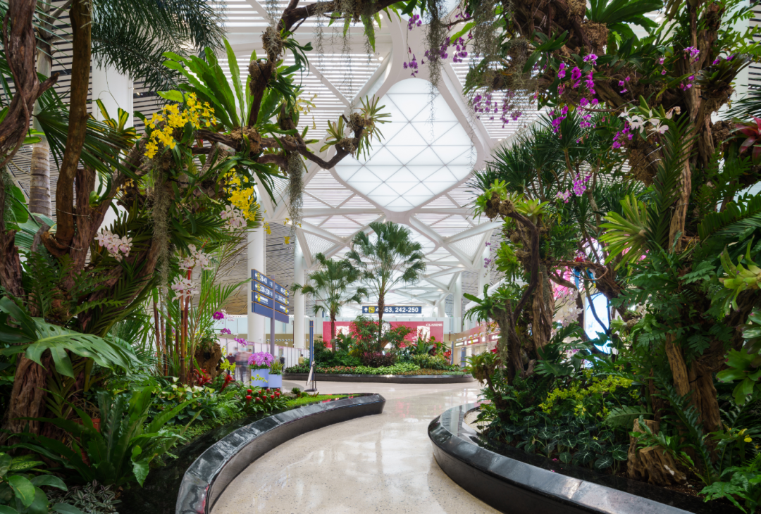我們希望旅客在經過安檢之后,能快速地緩解緊張的情緒,穿梭在綠化叢林之中,感受浸入式商業體驗。這里的景觀設計主要考慮了旅客安檢過后與商業空間的通達性。在流線設計上,兩側預留了充足的橫向交通路線,并利用縱向通道將各商業店鋪與安檢區出口對位,創造自然動線的同時,保證人行交通的順暢。我們還特意在中央商業街內做了結構降板,目的是為了給植物的根系提供更多的土壤,讓植物能夠更好地生長,從而更好地服務旅客。