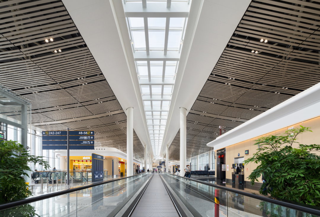中央商業街內,清新的空氣為植物的生長提供了充足的條件,明媚的陽光舒緩了旅客的心情,也激發了旅客在樓內購物的欲望。中央商業街的北側是商業店鋪,南側是安檢通道。在中央商業街中心綠廊景觀內,除了兩處面積較大的人群聚集休憩區,我們還設置了多處散落于景觀內的休息座椅供商業區消費者使用。中央商業街采光頂下還設置有遮陽膜,兩側設有遮陽格柵,白天可避免陽光直射,為室內提供一個舒適的光環境。夜晚遮陽膜又將結合燈具作為發光源,繼續為室內提供均勻的照度,給乘坐晚班飛機的旅客同白天一樣舒適愉悅的出行體驗。
