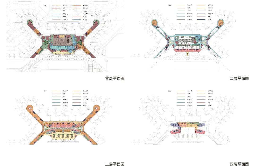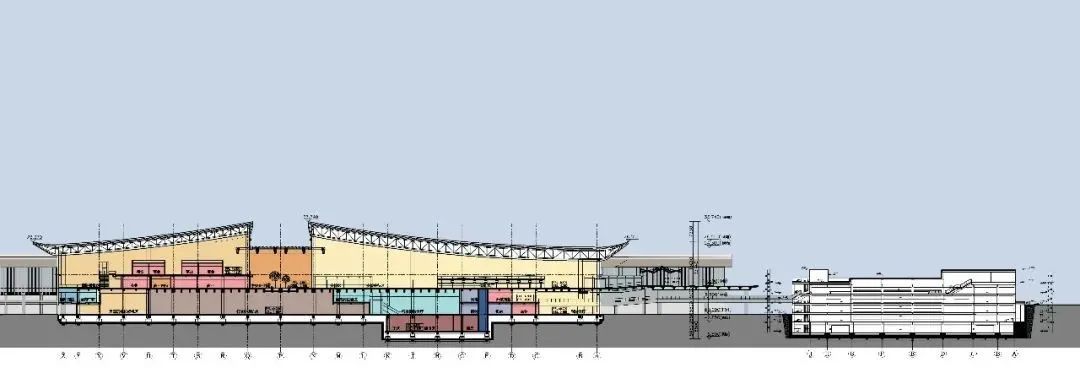 ▲ 剖面圖航站樓地上四層,地下一層。三層為出港層,二層為到達廊,首層為到港層。主樓局部設置四層和地下層。