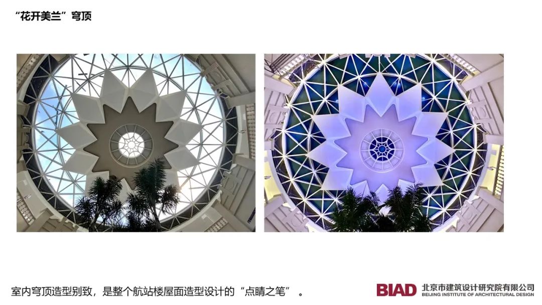 設計好了基本網格和基本單元,為了讓整體屋面更具特點,我們還對特殊位置進行了有趣的變化。位于指廊端頭,騎樓商業上方的圓形穹頂就是在標準單元之上的特殊處理。這里既保持了三角形基本網格的邏輯,又有所變化,是整個航站樓造型設計的“點睛之筆”。穹頂區域的室內造型別致。特殊位置的特殊處理造就了這個”網紅打卡點“的誕生。到了夜晚,我們還設計了可調控的照明。在不同的節日,點亮不同的顏色,烘托不同的節日氛圍。