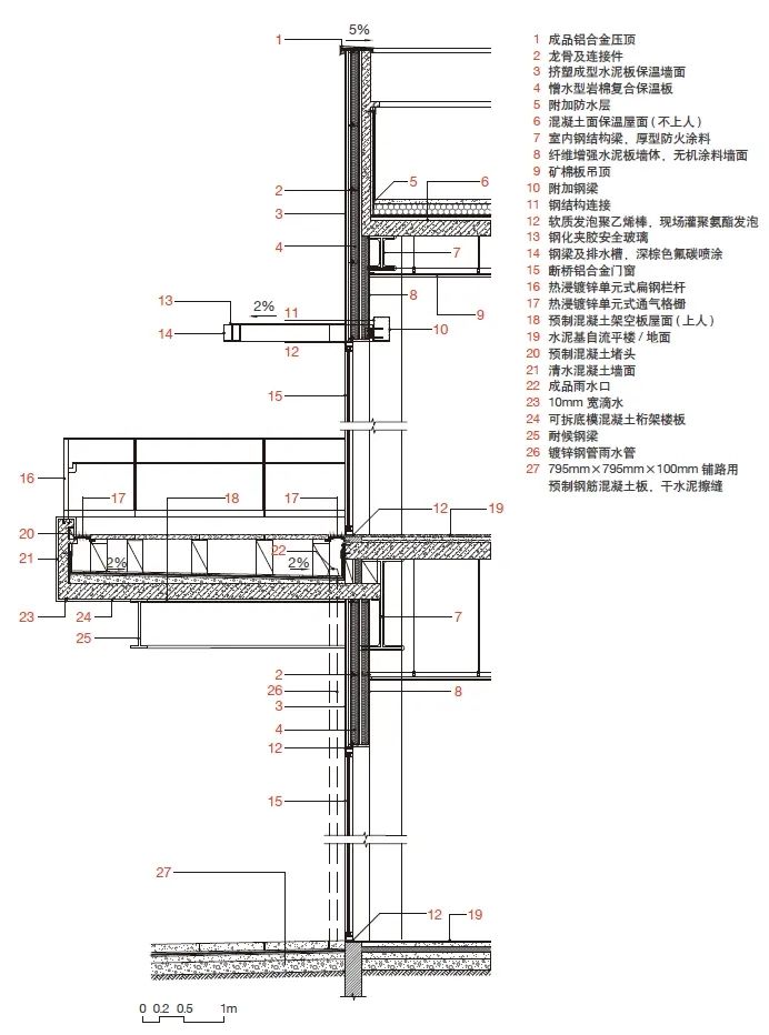 平臺對應擺渡車、轉播車、壓雪車等工作車輛停放,集裝箱、板房、臨時看臺等臨時設施設置以及消防車救援等分別控制平臺均布荷載。上人及堆載平臺采用預制混凝土磚架空屋面構造,為承載臨時設施的支座預留了空間(圖40、41)。同時架空層的空間高度也為賽時在平臺上設置覆雪連接道路的需求提供了可能性。平臺欄桿等室外工程項全部采用工廠單元預制、現場螺栓連接方式,減少現場焊接工作量和火災隱患。出發區木瓦屋面按照深化設計內容在風洞實驗室制作木瓦全構造層次樣板段,通過了專項的抗風測試,滿足“萬無一失”的工程建設要求。