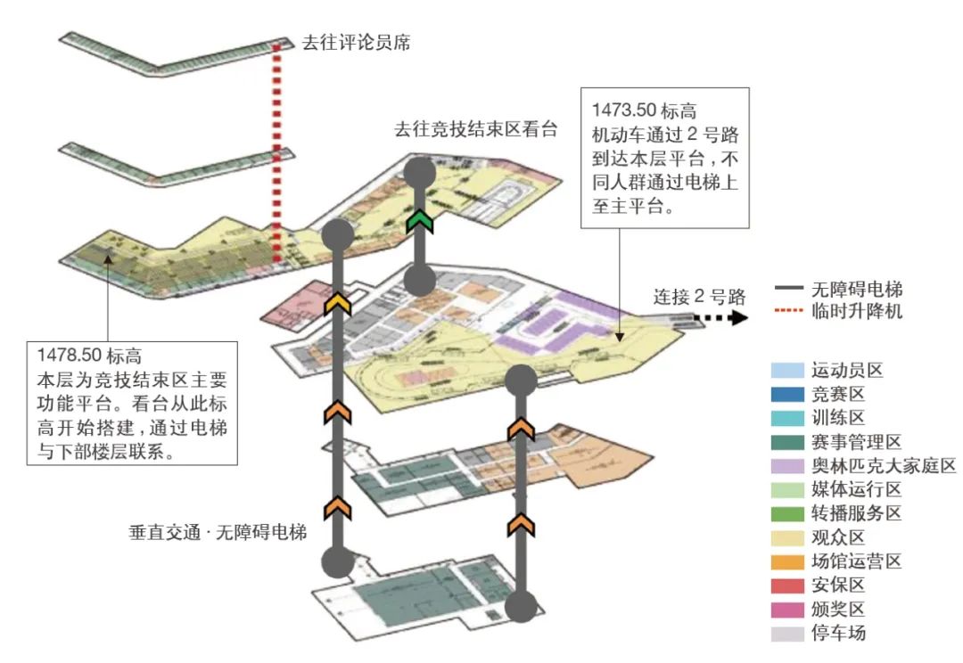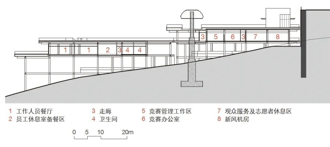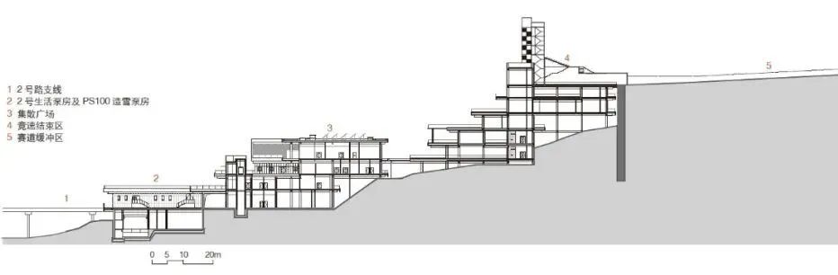 相對設施化的建筑語言反映了國家高山滑雪中心“低調而消隱”(Low-pitched and Hidden) [2]的設計態度。對材料品類的篩選提煉也是對山地建筑完成度的控制策略;考慮山地運輸及安裝條件,預先做了小尺度的板塊劃分,板材多采用開縫處理,減少施工工序;山地環境類別和嚴寒氣候分區要求設計對材料耐候性、耐久性、抗凍性、吸水率等相關技術參數嚴格控制;扶梯、電梯相應采取桁架內及井道內設置加熱設備來應對高山環境可能出現的極寒天氣;對停車及壓雪車過車平臺混凝土面層材料的抗鹽凍性要求進行了專家論證,采用F50抗凍混凝土配筋面層切實可行的解決方案。? 建筑設計-設計組織