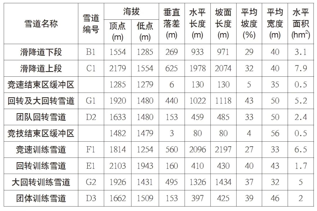 D2雪道主要承擔團體比賽項目。雪道要求平整寬闊,處在同一高程的地表變化與斜面坡度要基本一致,垂直落差153m,坡面長度485m,平均坡度33%,其中最大坡度40%,場地變化均勻舒展。雪道寬度均大于50m,可同時設置兩條以上地形雪情條件相同的滑行線路,結束區與回轉雪道合并一處,緩沖區長度大于80m。