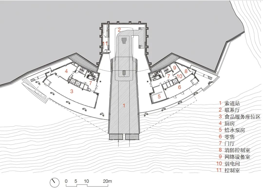 在兩個結束區集中應用迭臺形式之外,索道A、B線路各設置有中間站,A線路中站海拔標高1041m,是延慶冬奧村到集散廣場之間轉角站(圖32),B線路中站(即中間平臺,同時也設有C線路下站,在此由B換乘C至山頂出發區)海拔高度1554m,是集散廣場到競技結束區的轉角站(圖33)。設計將中間站視作集散廣場的“延伸”,形式選擇上也將其整合到上述策略中去。