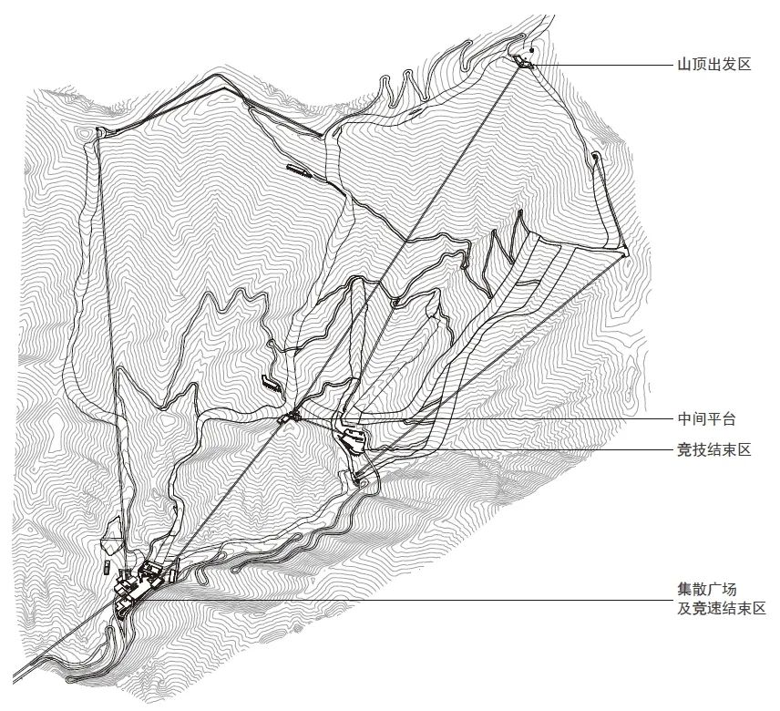 國家高山滑雪中心共設3條競賽雪道、4條訓練雪道以及其他聯系雪道和技術雪道,各類雪道總長度約為23.1km,最大垂直落差約925m。賽區內設置競速與競技兩個結束區,是服務賽事的核心區域,具備競賽終點、觀眾觀賽、賽事組織、交通集散等多種功能,兩個結束區以道路、索道及雪道相連。以往國際賽事雪道多按男子與女子技術難度不同,分設兩條比賽主雪道,國家高山滑雪中心雪道設計以競速與競技項目劃分為兩條主雪道,另加一條團體賽道,在滑降雪道中段設置了足夠的空間便于滑行線路的調整,以適合男子女子共用一條雪道滑行,滿足各項比賽的要求(圖5)。