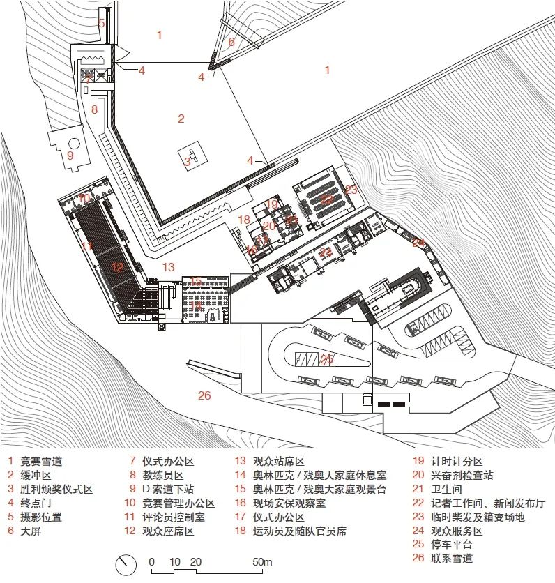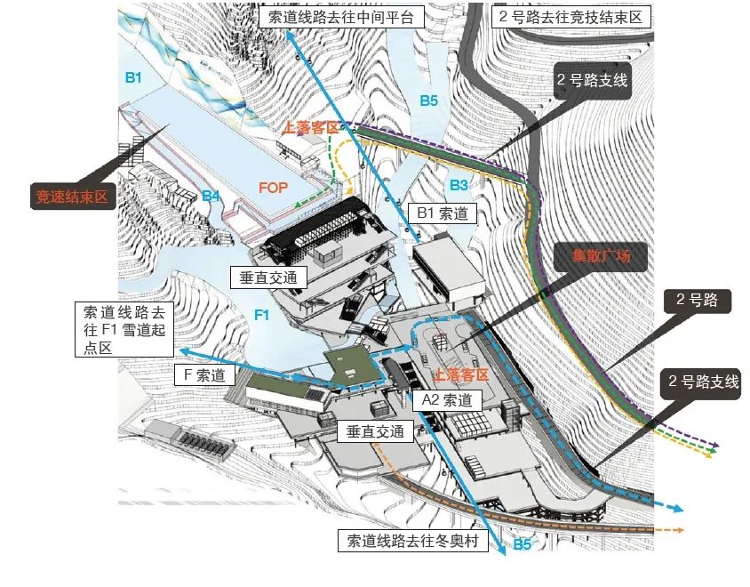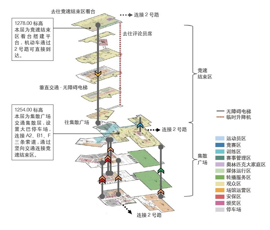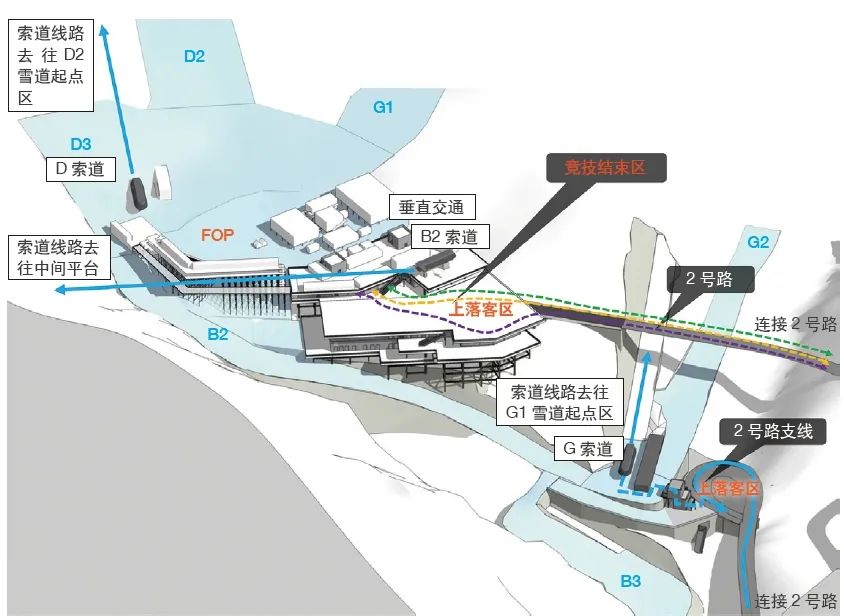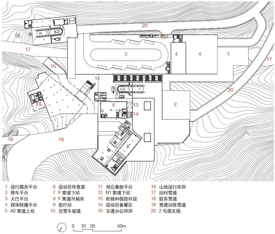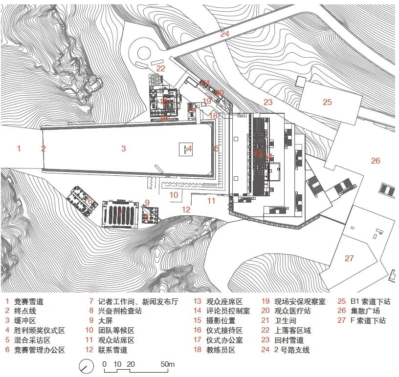 ,是國內第一座按冬奧賽事標準建設的高山滑雪場館,將進行北京2022年冬奧會和冬殘奧會高山滑雪所有項目的比賽[1]。國家高山滑雪中心位于延慶賽區核心區北部小海坨山南麓區域,整個用地近似菱形。頂端最高點為小海坨峰(2198.38m),以此峰向西南與東南沿山脊線方向延伸,底端匯聚于佛峪口溝上口(1238m)。整個地勢為各條溝谷從東北小海坨峰向下匯聚至西南角溝口,海拔高差約為960m,山體坡度大多在40%以上,滿足冬奧會高山滑雪競賽場地的需求。▲ 從賽道出發區俯瞰競速雪道、中間平臺、競技結束區(遠景為國家雪車雪橇中心)小海坨山地處溫帶大陸性季風氣候區,為典型的山地小氣候區,冬冷夏涼,冬季嚴寒干燥多風,最低1月份平均氣溫-8.36oC,山頂極端氣溫可達-37oC;冬季平均積雪深度14.6cm;年平均濕度為55%,最低濕度為34.6%;冬季山頂平均風速最大值22.6m/s。其特殊的地理位置(河北張家口與北京之間)、優越的地形地勢條件和理想的海拔高度,使其成為北京2022年冬奧會和冬殘奧會高山滑雪項目場址的最佳選擇。第24屆冬奧會工作領導小組第四次全體會議審議通過《北京2022年冬奧會延慶賽區核心區場館及設施規劃設計方案》,國家高山滑雪中心基地面積432.4h㎡,其中建設用地約6h㎡,永久建筑面積約4.3萬㎡,其中室外建筑面積(挑廊、平臺、樓梯等)約1.1萬㎡。根據國際奧委會(IOC)提供的競賽場館設計大綱(Venue Brief)2)通用文件及北京冬奧組委(BOCOG)各業務領域 3)的實際空間需求,賽時總體空間需求5.9萬㎡。設計落實各業務領域功能需求和各類人群 4)流線。容納核心功能的永久建筑及臨時設施分散布局,圍繞雪道規劃形成集散廣場及競速結束區、競技結束區、山頂出發區等主要建設區域(圖1)。賽區內共配置11條索道(編號A-H),解決從延慶冬奧村至集散廣場再到各功能區的主要交通需求。同時,為提高交通運輸保障能力,保證媒體轉播及冬殘奧會的運行需求專門設置了2號市政道路,該道路由延慶冬奧村通至集散廣場及兩個結束區,道路總長度約7.6km,平均坡度8%。▲ 圖1 國家高山滑雪中心主要功能區域分布