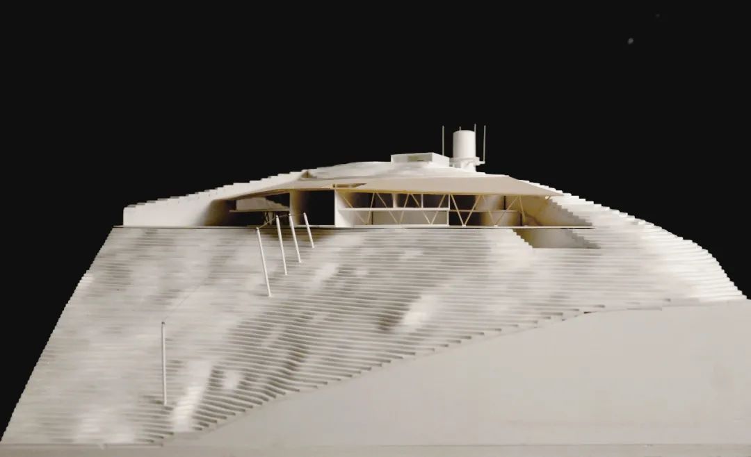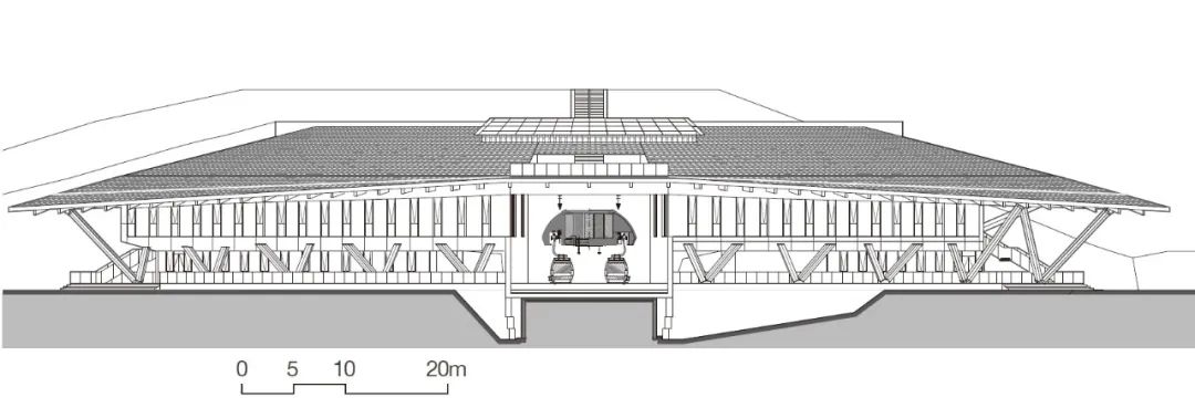 以上區域建筑沿山體錯迭布局,利用屋面形成挑廊及室外活動平臺,平臺之間采用均勻分布的豎向交通系統進行交通聯系,極大地化解了山地建筑對無障礙需求人群使用的不便。平臺賽時滿足臨時設施布置及功能擴展需求,賽后可轉換為室外活動場地。平臺下部結構采用網格狀鋼框架結構,為賽后功能擴充預留可能性。設計合理配置永久建筑、臨時設施和使用場地數量和規模,貫徹場館的可持續利用和環境的可持續發展設計理念,實現“可逆式”發展。出發區的設計策略則需要更多地引入關于奧運的文化主旨去回應承辦國家特色的宏大命題。協調建筑與自然的關系就是我們文化的一部分。山頂出發區建筑內部容納索道站并提供運動員休息空間。根據索道安全運行的場地水平長度需求,進行了適量土方開挖,形成半覆土建筑,設計控制建筑體量,最高點不高于小海坨峰頂的海拔高度,表達對自然的敬畏(圖34、35)。山頂出發區擁有獨特的景觀視野,外立面從外到內考慮深遠挑檐、廊道露臺、遮陽景窗等空間化設計方式,綜合解決了功能、節能和美觀的多方面需求。建筑以坡屋面回應中國傳統建筑的歷史淵源,以樸實的木瓦作為屋面材料體現地域及場所特征,表明本屆冬奧會承辦國家的文化特質,同時坡屋面造型經過了幾何化操作,又賦予其一定的獨特性和當代性(圖36)。頂部設置的觀山廊和“長卷”景窗提供了可以遠眺國家雪車雪橇中心、延慶冬奧村和山地新聞中心的平遠景致,一幅勝景映現于觀者的眼前(圖37),錯綜的賽道擬合于海坨山脈,正如雛燕之形,暨場館“雪飛燕”命名的由來。▲ 圖34 山頂出發區(含天氣雷達站)模型