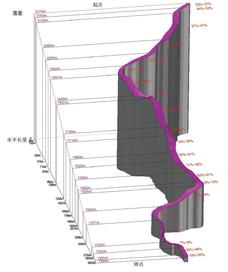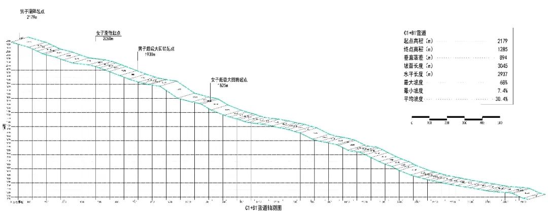 競速雪道由上下兩段(C1+B1)雪道組成,主要承擔滑降與超級大回轉的比賽,雪道位于用地的中軸對角線上,起點高程2179m,終點高程1285m,垂直落差894m,平均寬度40m,坡面長度3045m,平均坡度為30%,其中最大坡度68%,最小坡度7.2%(圖7、8)。競速雪道緩沖區長度140m,最寬處130m,坡度5%,場地面積約1.26萬㎡,滿足賽事各項綜合需求。