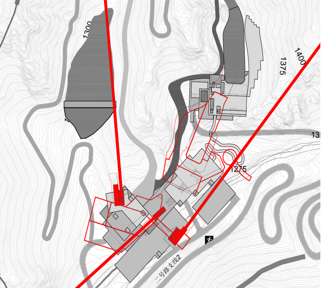 國家高山滑雪中心雪道均處在山體南向坡,為保障本屆賽事期間(2022年2月4日-3月13日)雪道質量,延緩融雪速度,所有雪道均為人工造雪,競賽雪道雪面須制造成為冰狀雪以提高雪質硬度,雪質密度須達到590kg/m3。競賽雪道、訓練雪道覆雪厚度2m,技術雪道1m。賽區造雪用水采用區外調水與區內調蓄相結合的方式,賽區內設三級蓄水設施,總蓄水量為15~18萬m3,滿足在環境條件允許的情況下連續三天不間斷造雪的需求。針對造雪點的不同高程設三級提升泵房。同時,考慮融雪水的回收與利用,在佛峪口主溝下游設蓄水塘壩,雪道融雪水最終均匯流于此。國家高山滑雪中心冬季山頂區域經常出現強風天氣,2019年冬季平均風速最大值為22.6m/s,風向主要為西北風與北風,對造雪存雪、雪道維護、雪道質量造成很大影響。針對上述情況,在受大風影響的雪道區域設置防風柵欄,并根據不同區域風力的強弱和需保護的雪道范圍,確定防風柵欄的高度與透風率,通過前期風洞試驗模擬及兩年實際測試,最終設定柵欄高度在4~8m之間,透風率為50%~70%,防風效果顯著。? 建筑設計-限制條件