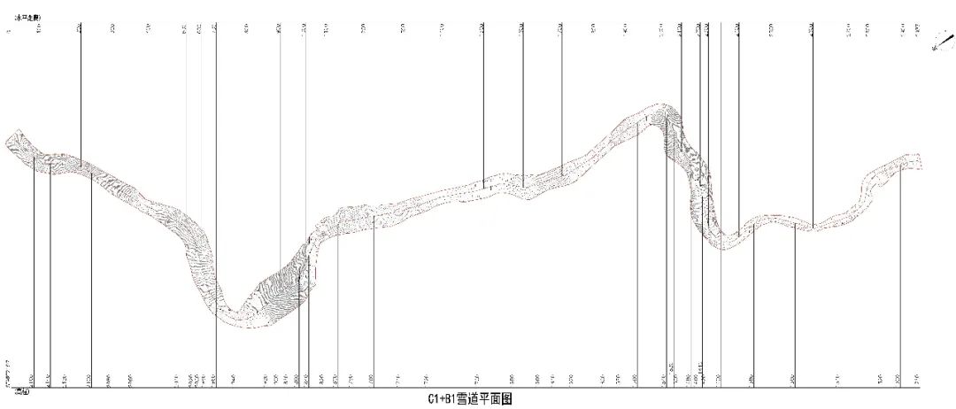 ▲ 圖11 滑降雪道(C1+B1)軸測競技雪道為G1雪道,主要承擔回轉與大回轉比賽項目。雪道位于賽區東南的山脊之上,形狀呈反L形,垂直落差440m,坡面長度1118m,平均寬度50m,雪道寬度滿足不同滑行線路的設置需求(圖12)。雪道地形起伏呈波浪形,起始部分坡度較陡,最大坡度達68%,適應于大回轉比賽;雪道下段地形變化平緩,坡度主要在33%-50%之間,并設置一處轉彎,以滿足回轉比賽要求。