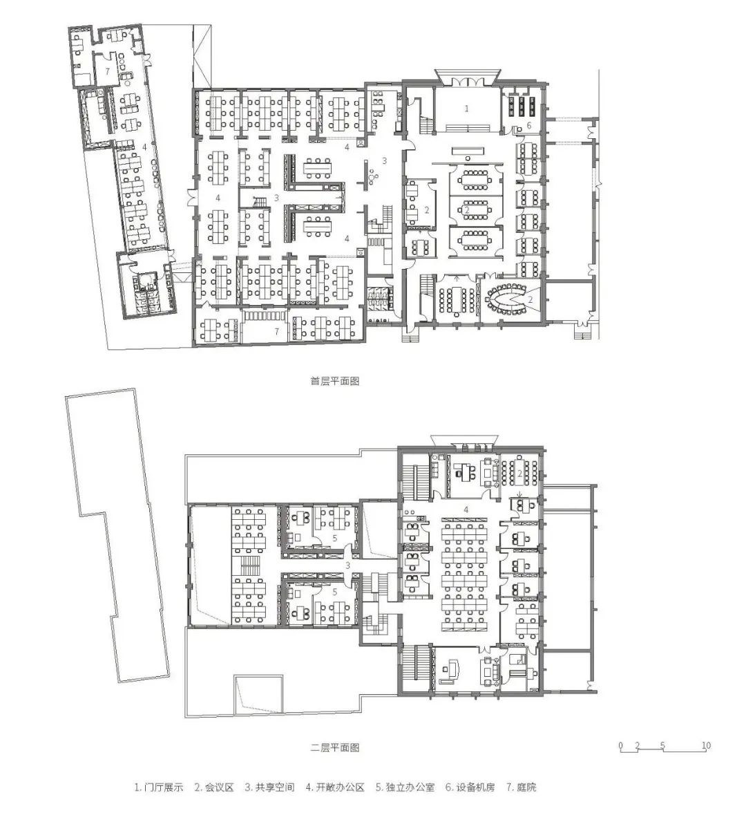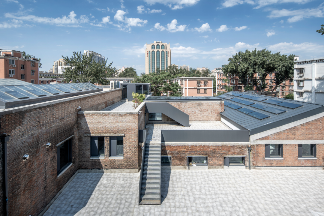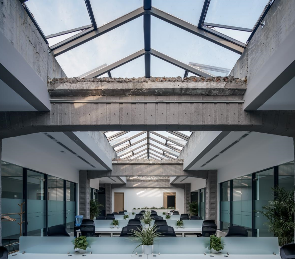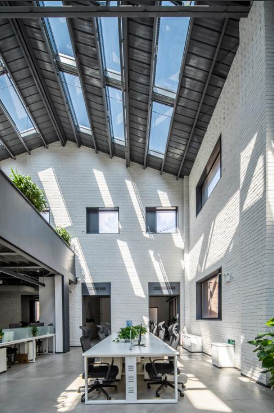 通過(guò)結(jié)合現(xiàn)狀有機(jī)改造更新,改造后的建筑能作為滿足現(xiàn)代辦公的場(chǎng)所服務(wù)于未來(lái)的適用人群?,F(xiàn)有首二層空間均為辦公空間及其輔助空間。首層營(yíng)造了若干公共空間,供辦公人群使用,通過(guò)局部樓板的拆除,設(shè)置了溝通交往廳,豐富了辦公人群日常的行為溝通模式。二層利用原先廢舊的煙囪空間局部增加梁板,將兩側(cè)的辦公空間徹底連接,原本松散的建筑空間被統(tǒng)一的設(shè)計(jì)整合,能較好的適應(yīng)現(xiàn)行辦公空間的需求。從打造綠色辦公空間的角度出發(fā),設(shè)計(jì)中采用了多種手段,通過(guò)局部樓板的拆除設(shè)置了共享空間,布置室內(nèi)綠植,在建筑西側(cè)部分通過(guò)局部拆除設(shè)置了內(nèi)院,有效解決了周圍房間的采光通風(fēng)問(wèn)題,也提供了綠植的種植場(chǎng)地。