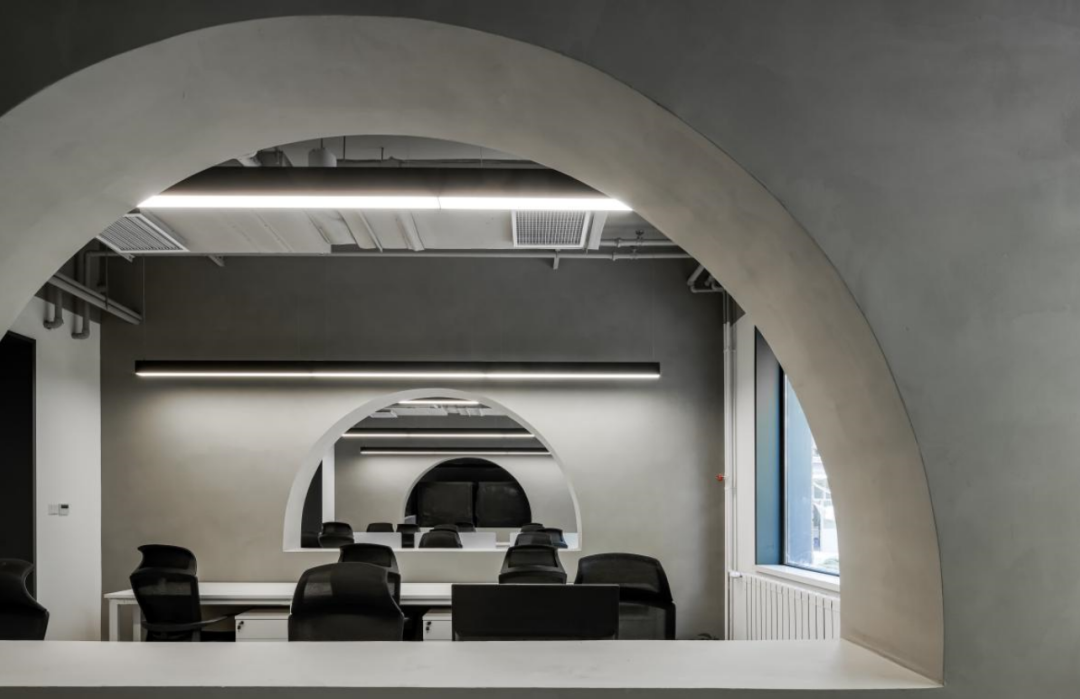 通過(guò)有機(jī)的設(shè)計(jì)手法化解既有建筑的不利條件。現(xiàn)狀建筑有大量沒(méi)有采光條件的小開間,為了改善未來(lái)辦公條件,在隔墻上開設(shè)了半月形的月亮窗,將若干封閉隔絕的小空間的界限打破變成了流動(dòng)的空間。原本用作廚房排油煙的煙囪構(gòu)筑物,通過(guò)增設(shè)樓板,形成了連接南北兩側(cè)辦公空間的交通空間,把不利條件變?yōu)橛欣麠l件。