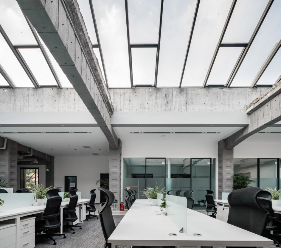 如何為未來(lái)可能的應(yīng)用場(chǎng)景提供更多開放的建筑空間。由于在改造初期并未確定未來(lái)的實(shí)際辦公承租方,為了能滿足不同公司的辦公需求,將辦公空間定義為以開敞辦公為主,輔助若干小間獨(dú)立辦公室,并且在后期的二次精裝過(guò)程中貫徹了最初的設(shè)計(jì)思路,保留了整體的公共空間和開敞辦公空間。