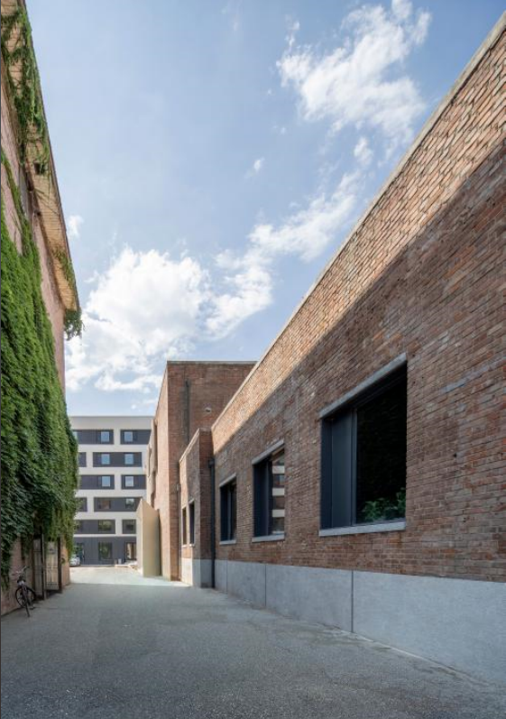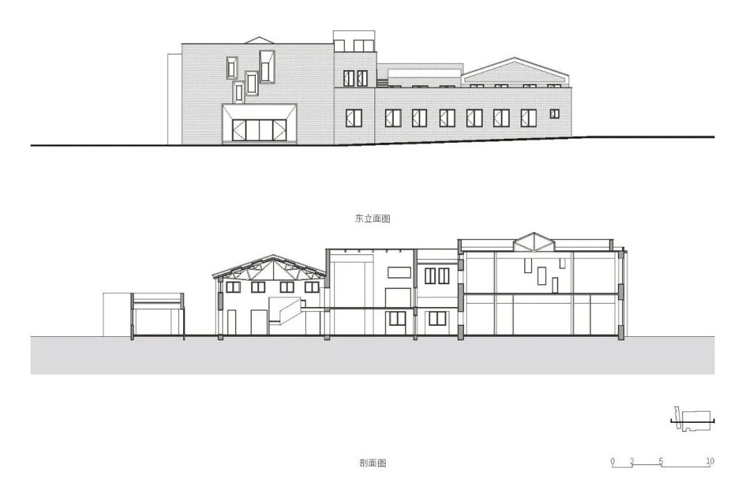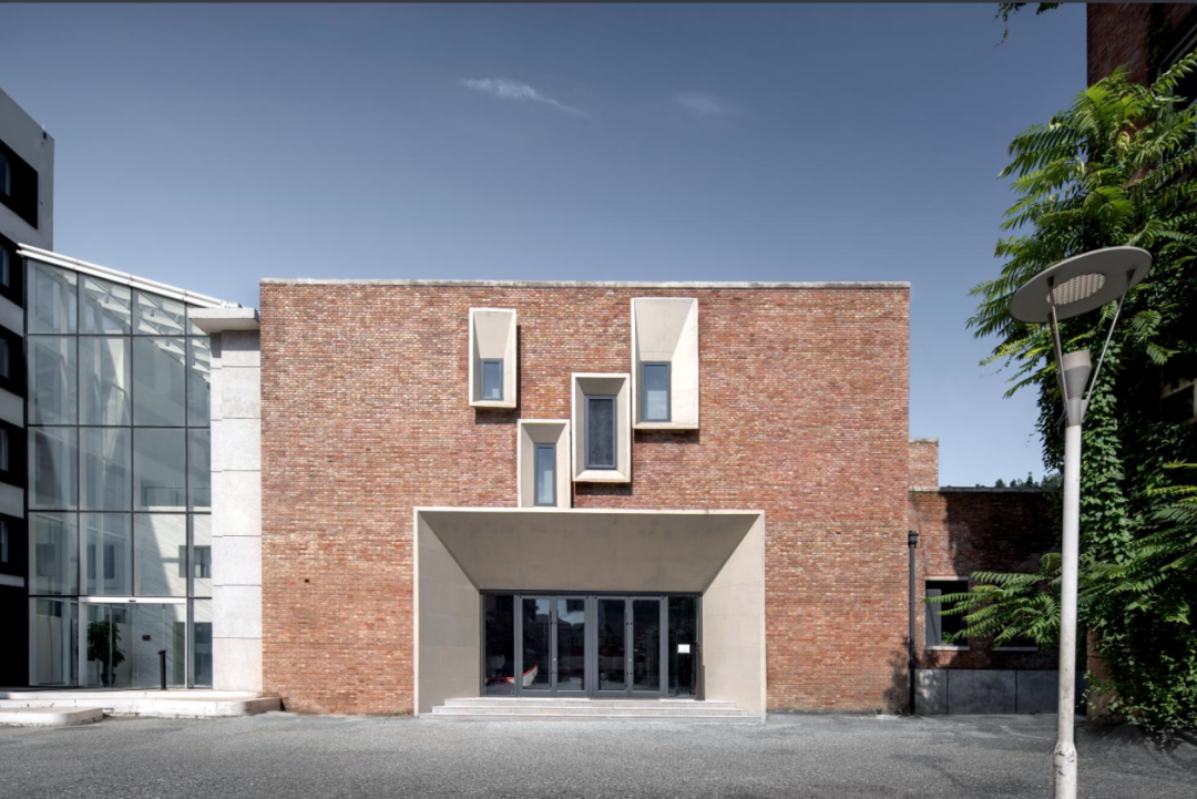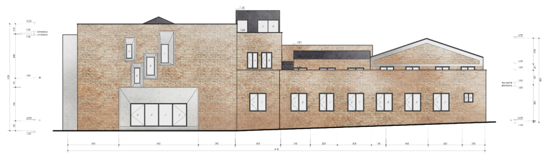 整合園區(qū)內(nèi)的公共空間,變消極為積極。我們?cè)诒3纸ㄖ酗L(fēng)貌的的前提下,盡量提高立面的品質(zhì),打造有親和力的積極的立面。建筑外立面沿用了現(xiàn)狀最初的清水磚墻外立面,對(duì)現(xiàn)存狀況較好的立面做了相應(yīng)清洗,修補(bǔ)狀況不佳的立面。建筑東立面將原本飯店加建的仿古門頭徹底拆除,新建清水混凝土門頭,強(qiáng)化了建筑主入口的儀式感,二層通過(guò)與一層相似形體的變化設(shè)置了4個(gè)清水混凝土外窗框,改善了二層?xùn)|側(cè)區(qū)域的采光條件。