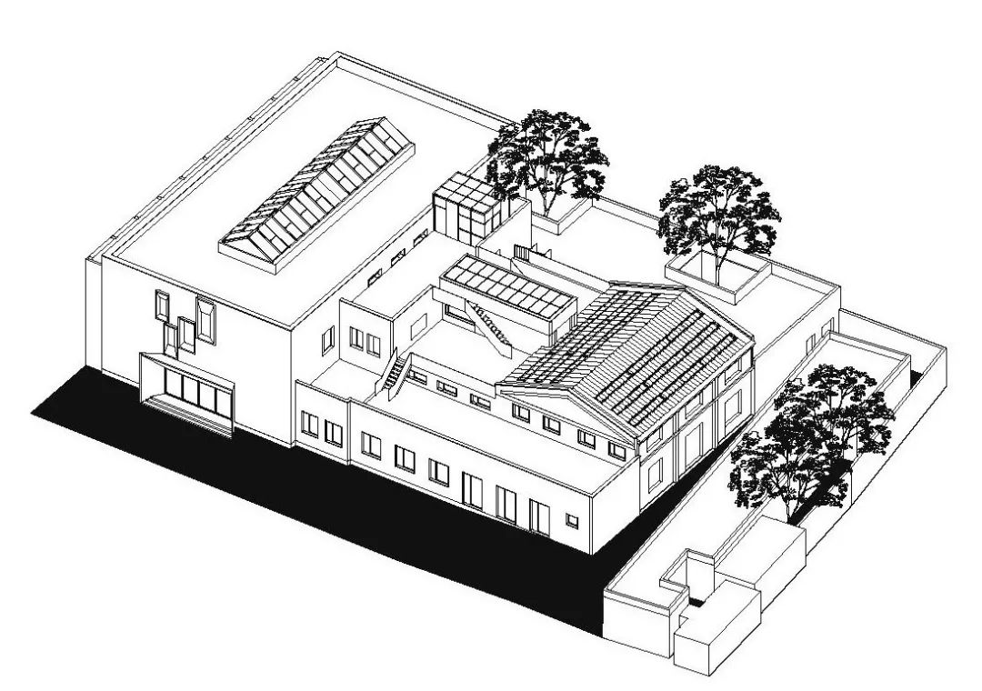 在進(jìn)行改造前,設(shè)計(jì)團(tuán)隊(duì)對(duì)現(xiàn)狀建筑進(jìn)行了整體評(píng)估?,F(xiàn)狀建筑在1973年建成后,經(jīng)過(guò)若干次加建改建形成了非常復(fù)雜的建筑形體。主體部分為內(nèi)框架體系的二層建筑,北側(cè)附著了若干一層平房和作為員工宿舍的二層坡屋頂建筑。整體建筑缺少足夠的采光,隔墻眾多,有大量小開間的黑房間。同時(shí)想要作為現(xiàn)代辦公空間,現(xiàn)狀建筑缺少較為合適的公共空間。